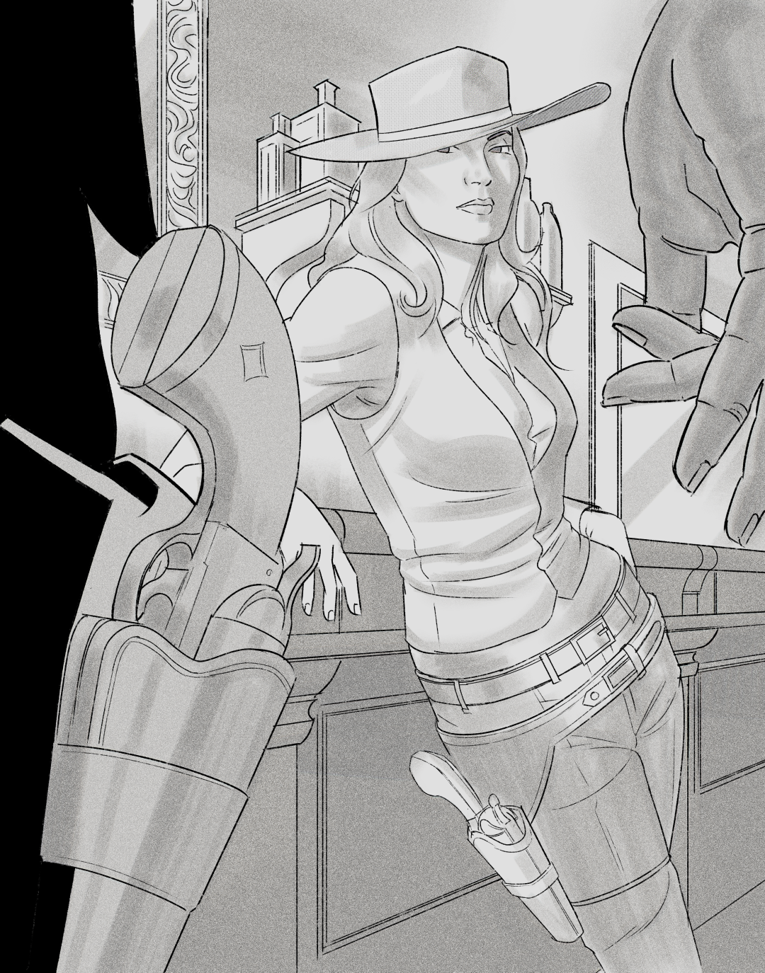 First digital progress step refining lines and greyscale for the gunfighter artwork.
